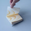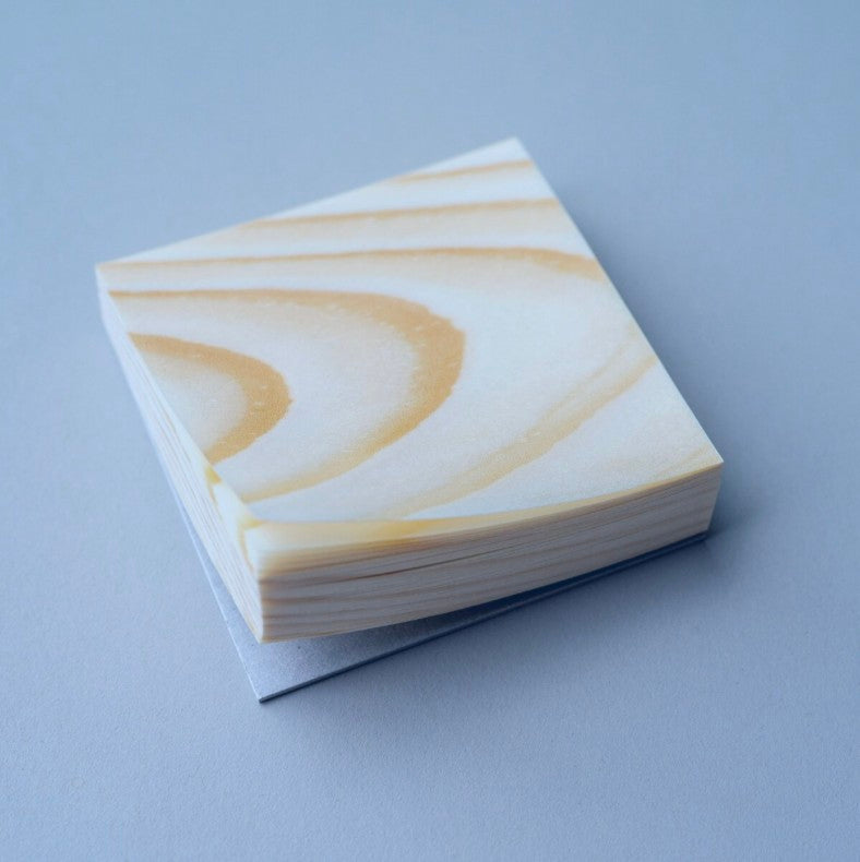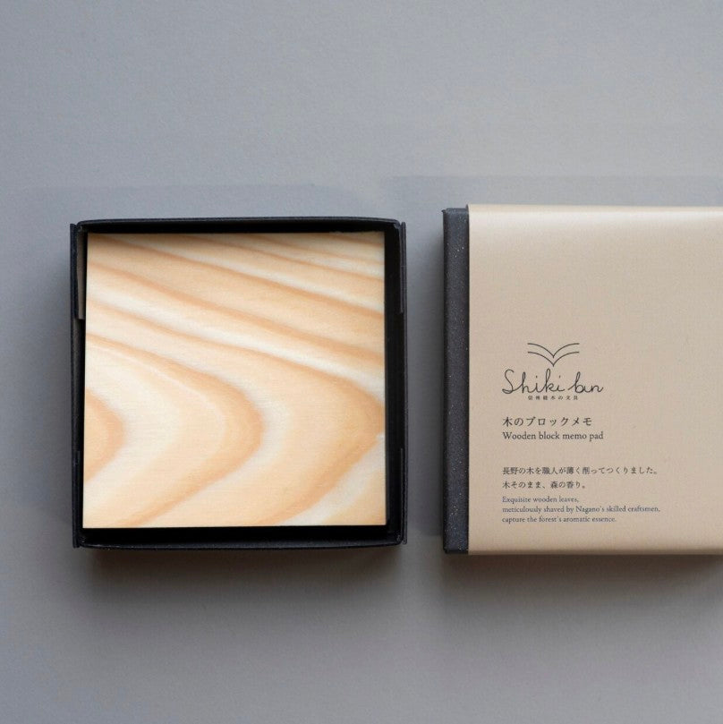 80-page memo block in gift box. Pages made from unprocessed Japanese red pine shaved to a remarkable thinness and then dried. Tree rings are visible from the cross section. Use it for quick notes, message notes, and small letters. Pages may also be used for serving snacks as the wood is untreated. The soft fragrance of red pine is present.