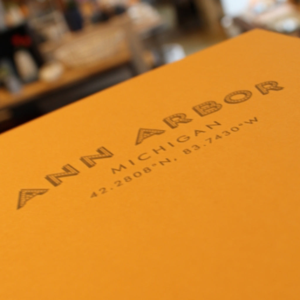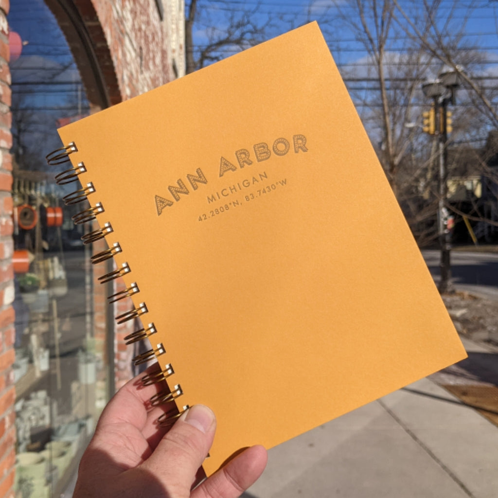 A custom made Ann Arbor notebook is the best gift! 'Ann Arbor Michigan' and coordinates, custom press printed for Found, on a saffron cover.