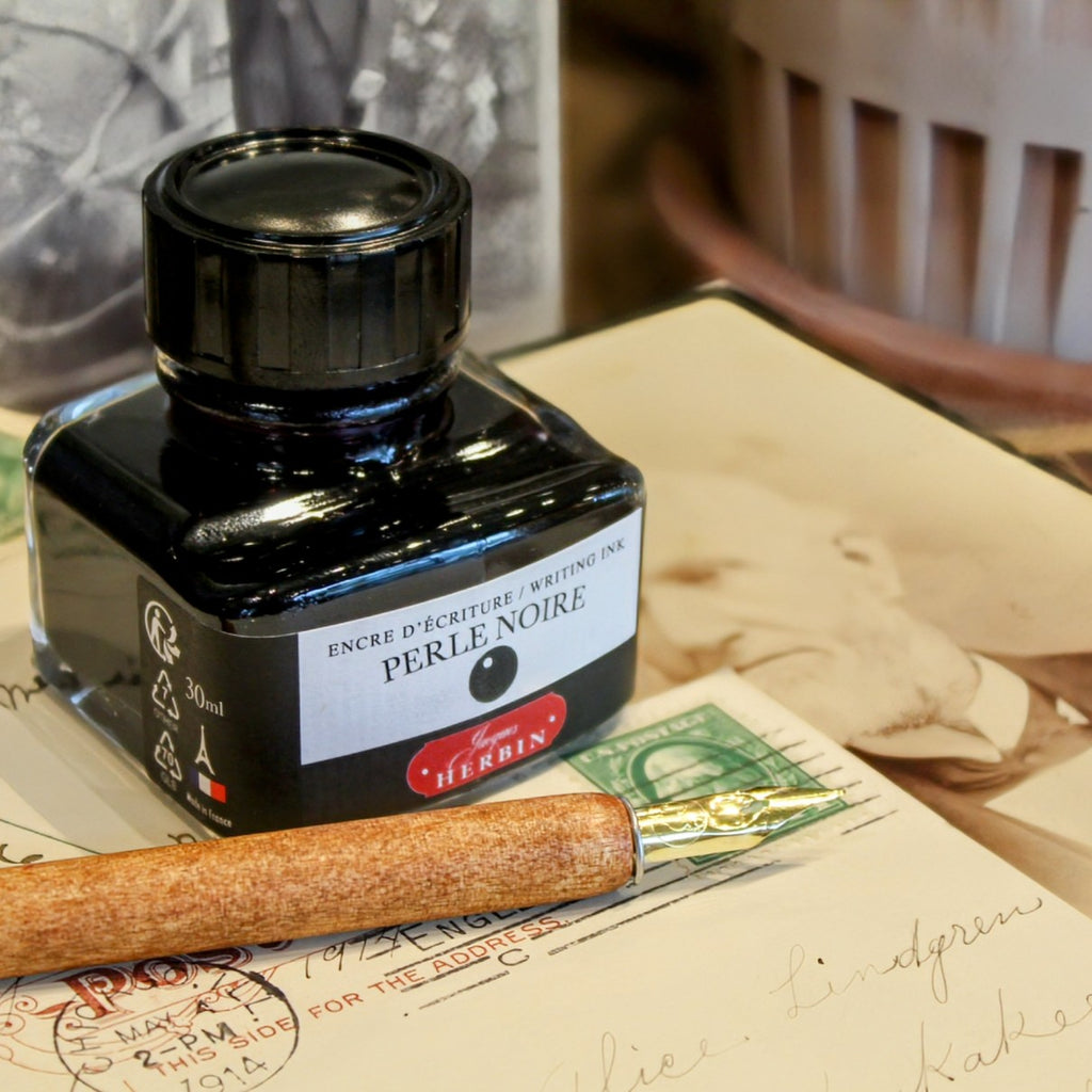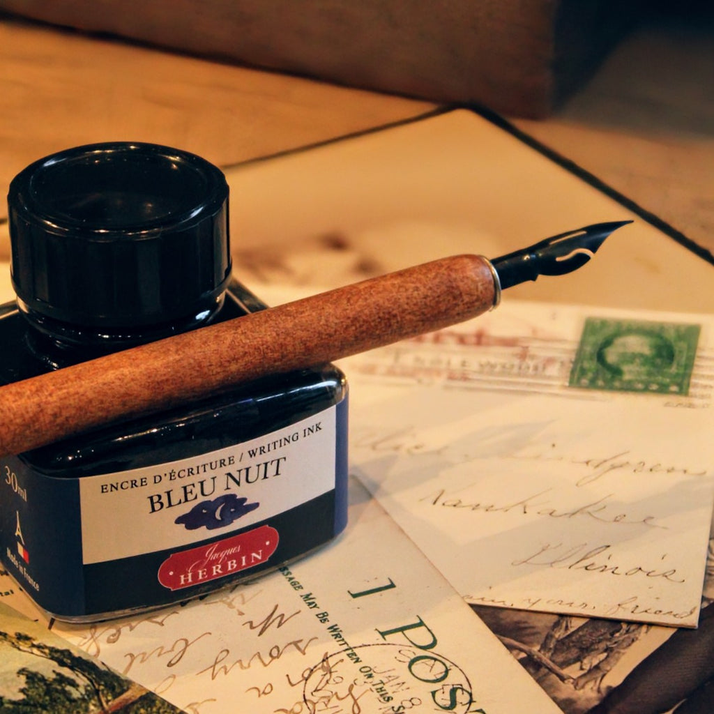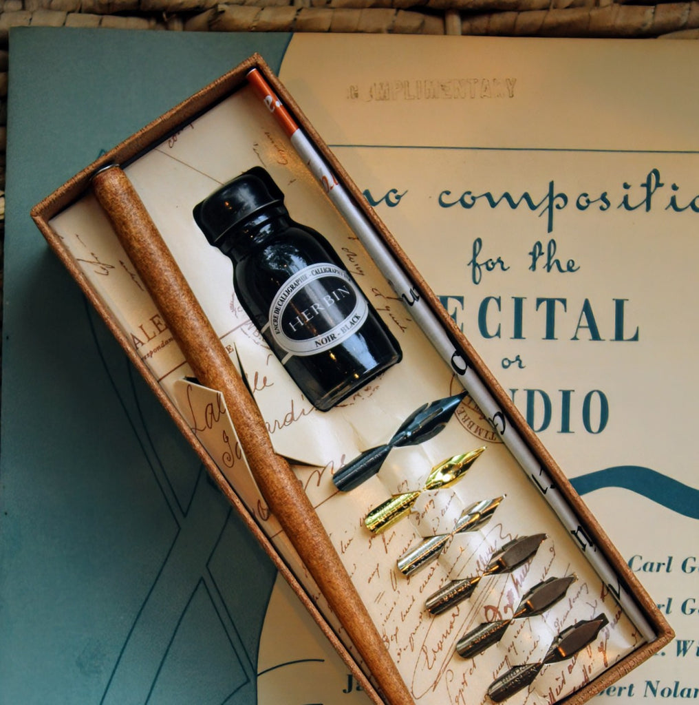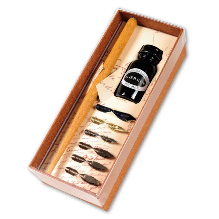 Brause has been manufacturing steel nibs in Germany since 1850 and are a favorite of professional and student calligraphers alike. This set includes 6 of the most popular nibs (1 - Cito Fein, 1 - Pfannen, 1- Steno, 1 each Bandzug 1mm, 2mm, 3mm) a natural wood nib holder and small bottle of black Herbin ink. A great gift for any budding or advance calligrapher!