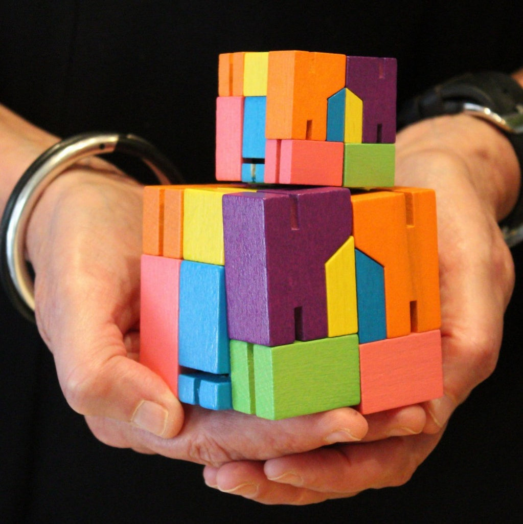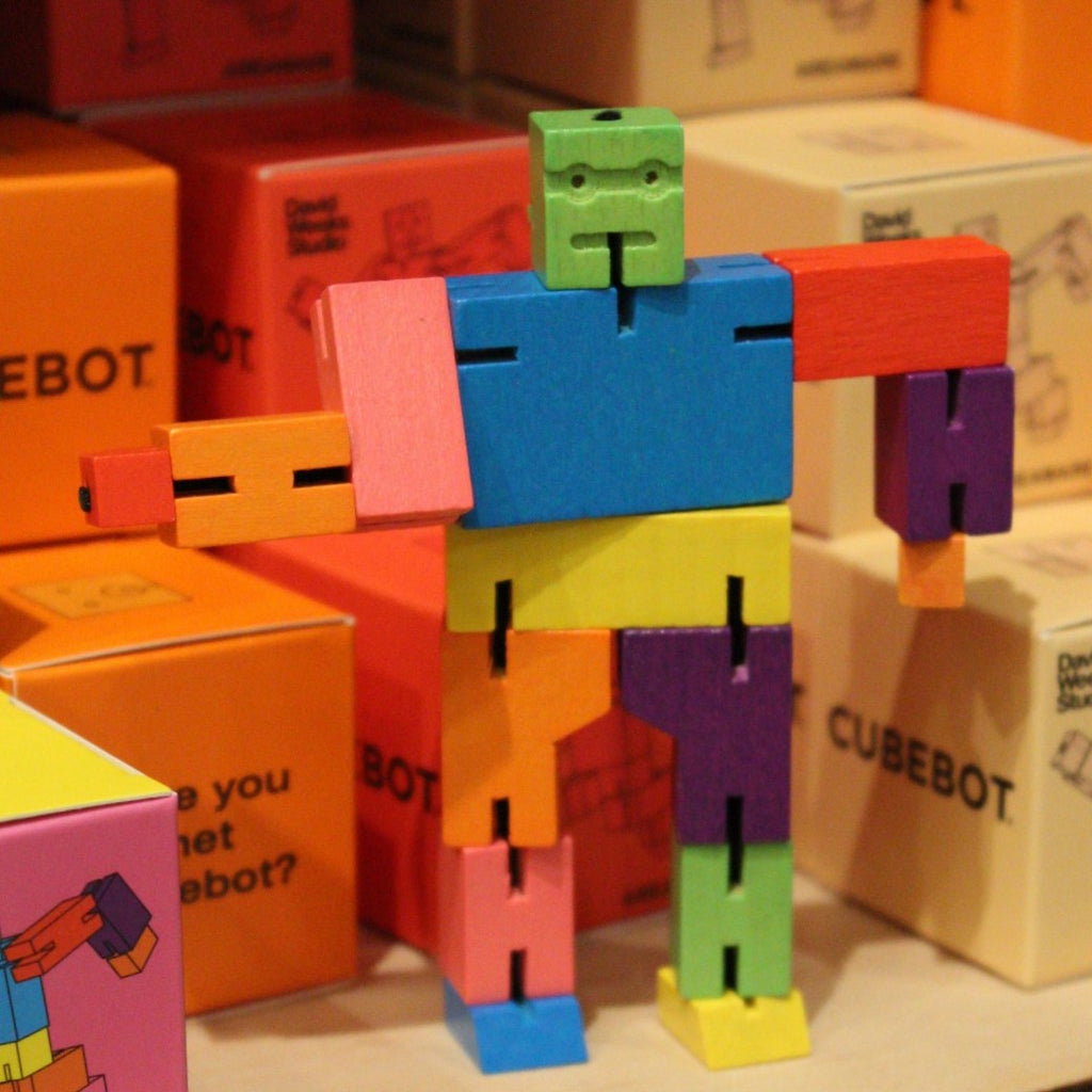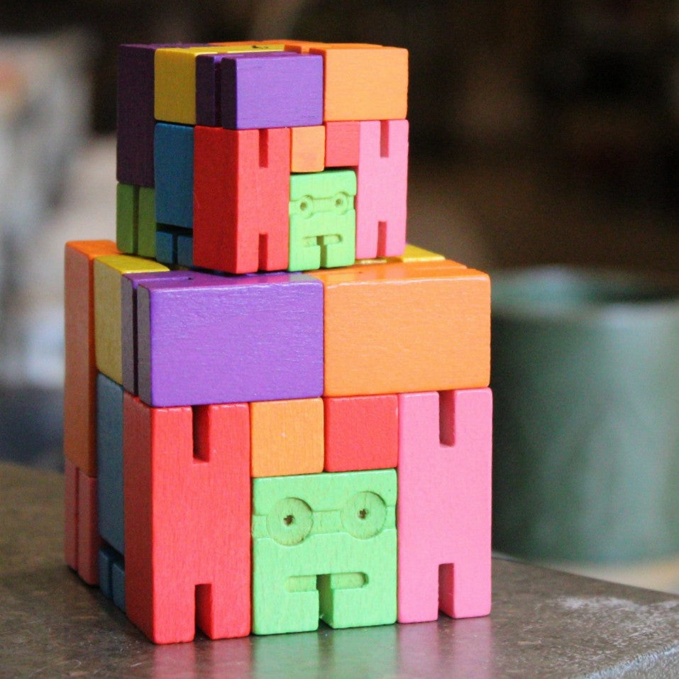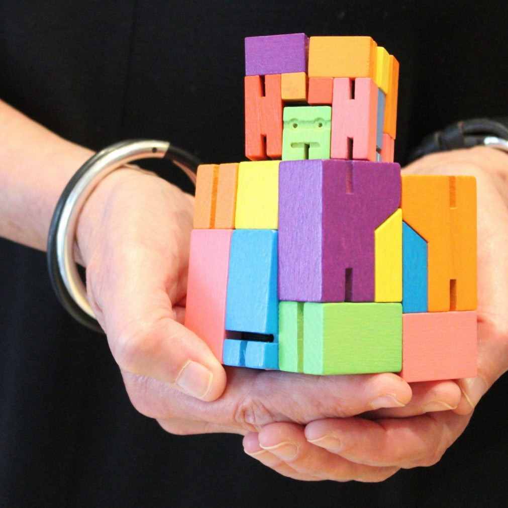Cubebot® is a wooden toy robot inspired by Japanese Shinto Kumi-ki puzzles. Made from wood and elastic, Cubebot can be positioned to hold dozens of poses. When it's time to rest, Cubebot folds back into a perfect cube. A classic toy for all ages that will endure generations of play. Recommended for ages 3 years old and up.