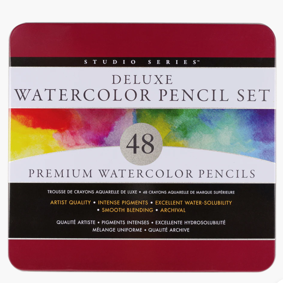 48 top-notch watercolor pencils. Perfect blend of precision and expression in your art. Vibrant pigments blend effortlessly. Go for a watercolor effect by using a wet brush. Super comfy grip for a smooth drawing experience. Suitable for both professionals and amateurs. Deluxe storage tin included for keeping pencils secure and organized. Two layers of pencils stored in flat trays.