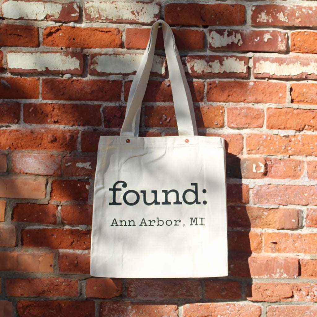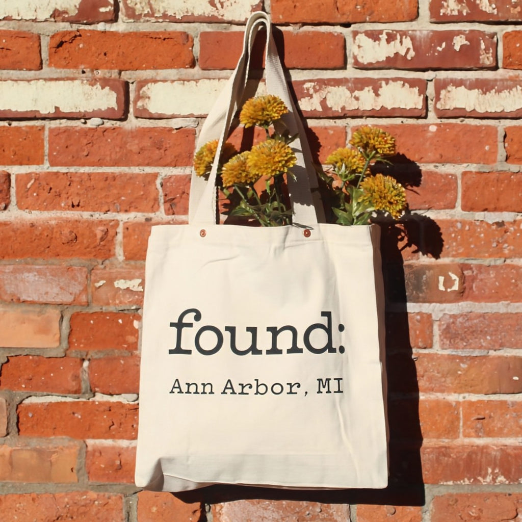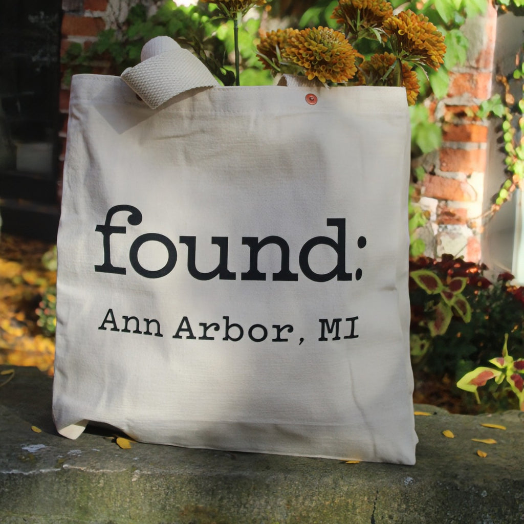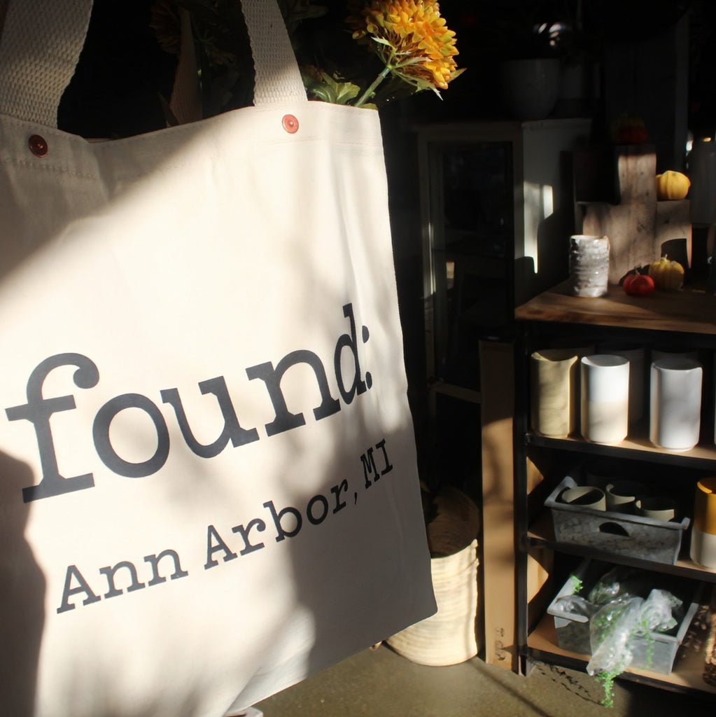 Take a little piece of Ann Arbor everywhere you go with our exclusive FOUND tote bag. Made of 100% brushed cotton canvas featuring our logo printed on one side. Spacious enough for everyday errands, books, groceries, or market finds. A great reusable alternative to show some local love!