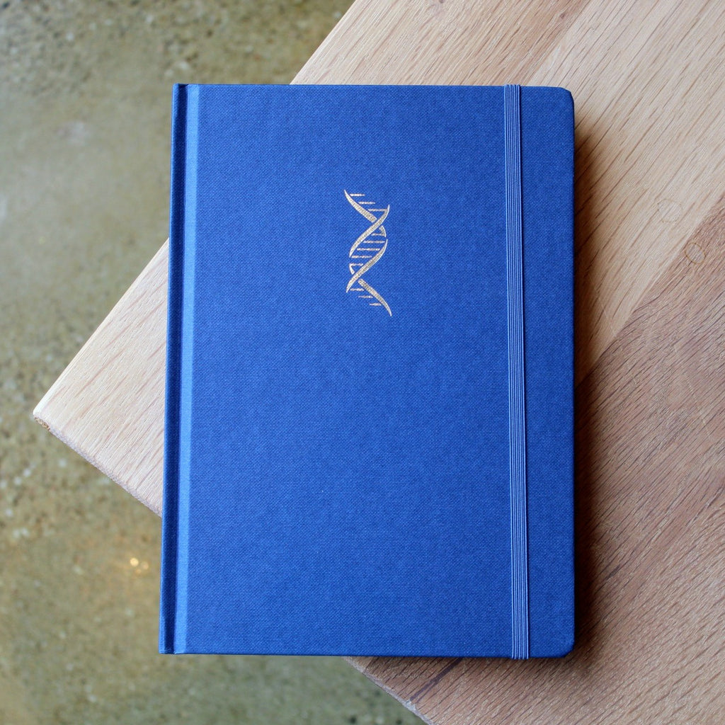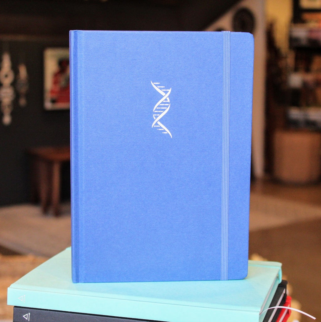 This tech blue notebook has an elegant DNA helix stamped in silver foil on its cover.