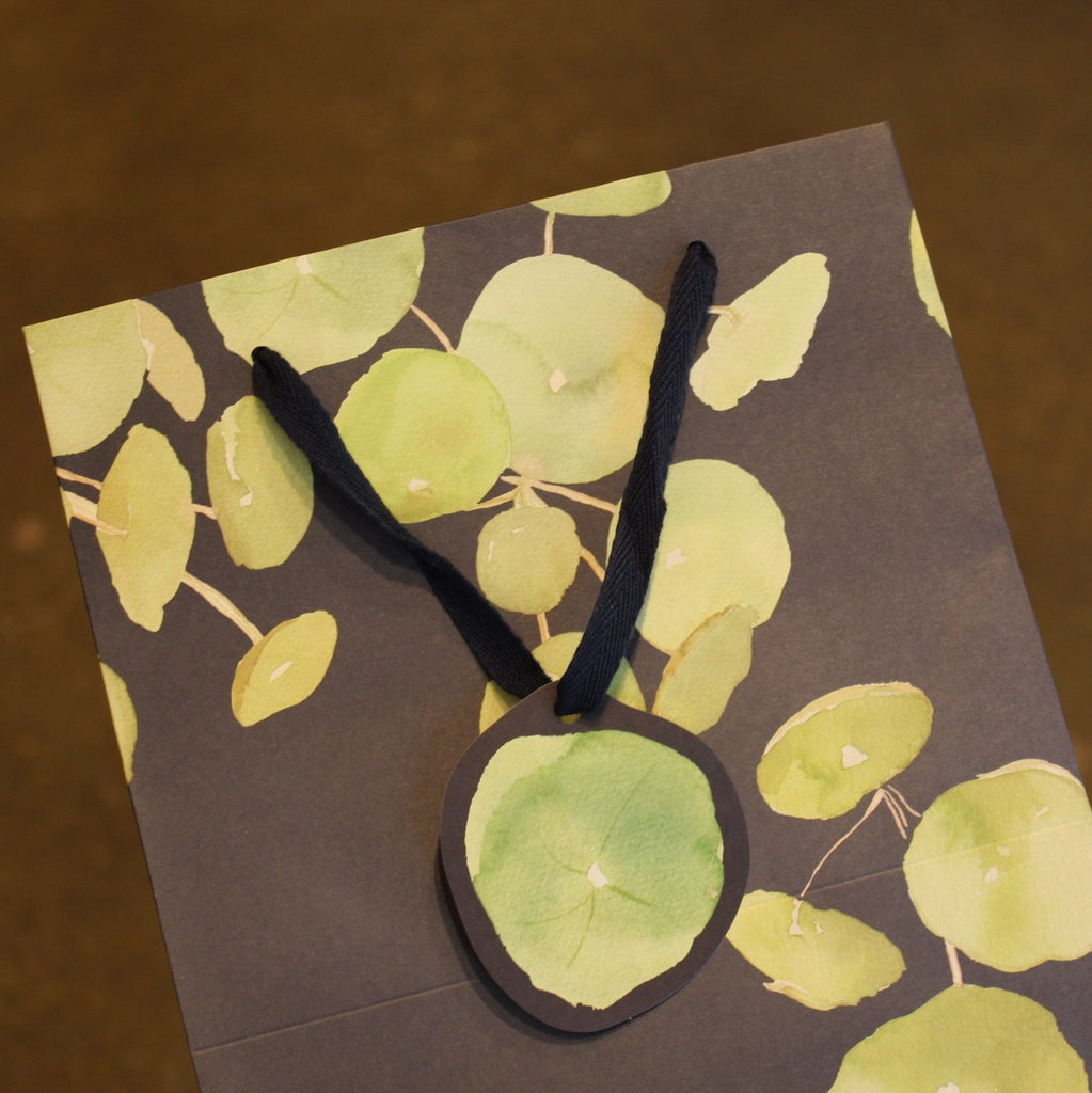 These gift bags are handmade from 100% recycled paper, and are 100% recyclable! Cotton ribbon handles are dyed to match the rich, colorful illustrations. Insanely adorable die cut tag included.