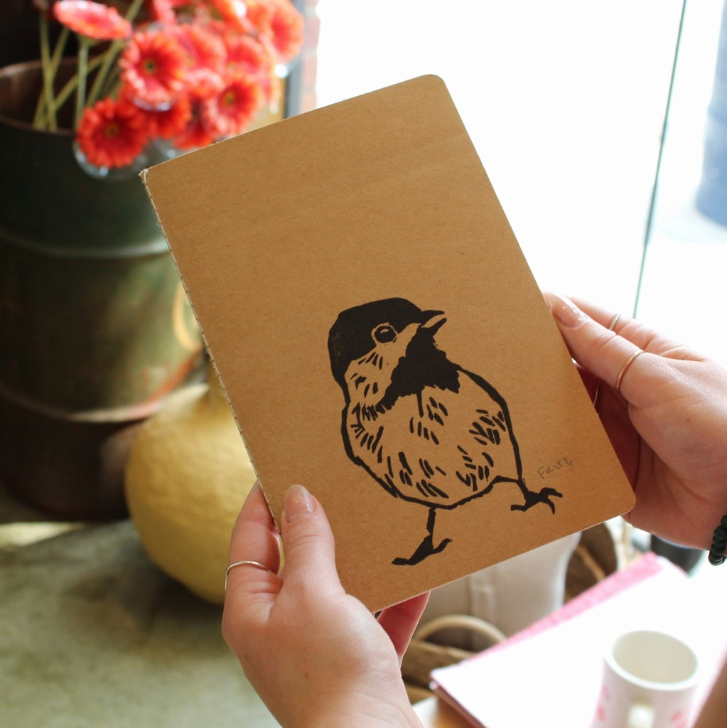 This adorable little chickadee is on a notebook! Hand printed A5 size notebook or journal with a kraft paper cover and 60 unlined pages inside. Perfect gift for the bird lover in your life.