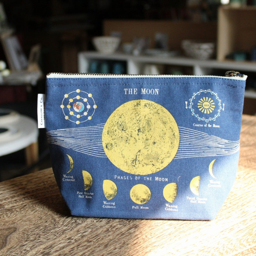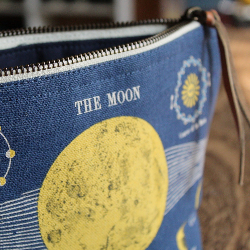 Vintage moon chart printed on a zippered pouch made from 100% natural cotton. Featuring a high quality YKK zipper, a leather zipper pull, and dark navy cotton lining. These stylish pouches are perfect for your small art supplies, makeup, and on the go essentials.