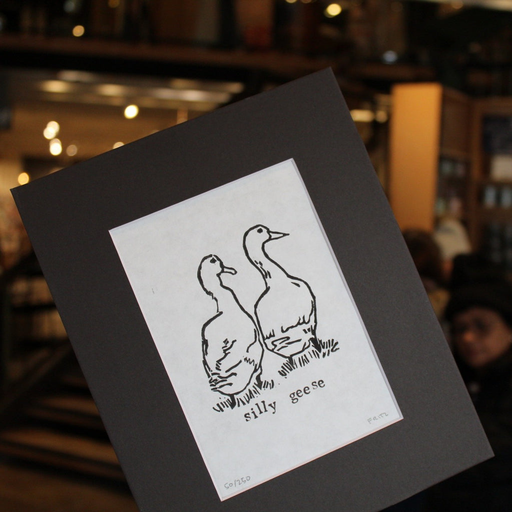 A one-color block hand printed in Michigan on 8 x 10 black lightweight high-quality printmaking paper, hand-printed with Cranfield Caligo Safewash inks.