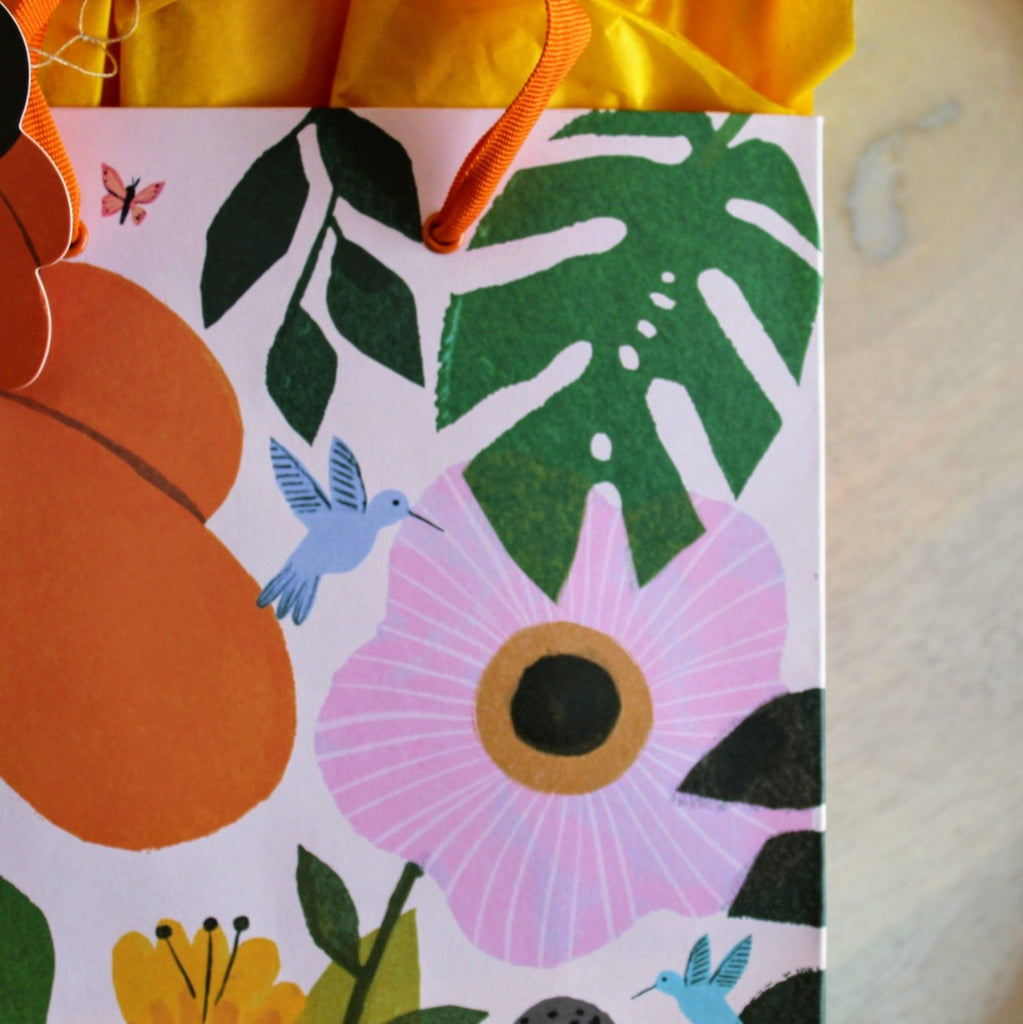 The perfect presentation for gorgeous gifts! Beautifully illustrated gift bags printed on recyclable, un-laminated paper stock. Each gift bag features a die-cut tag and matching grosgrain ribbon handles. Features artwork by Aura Lewis.