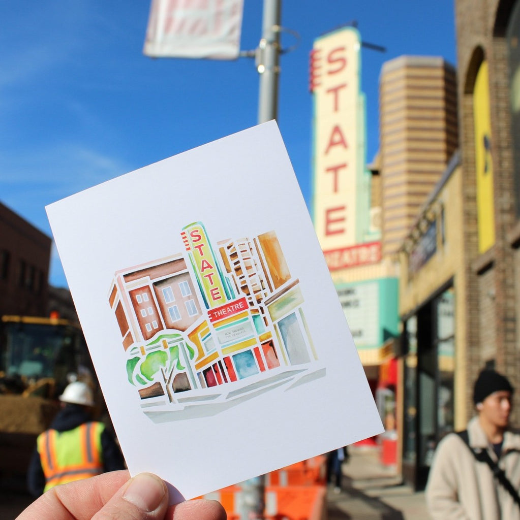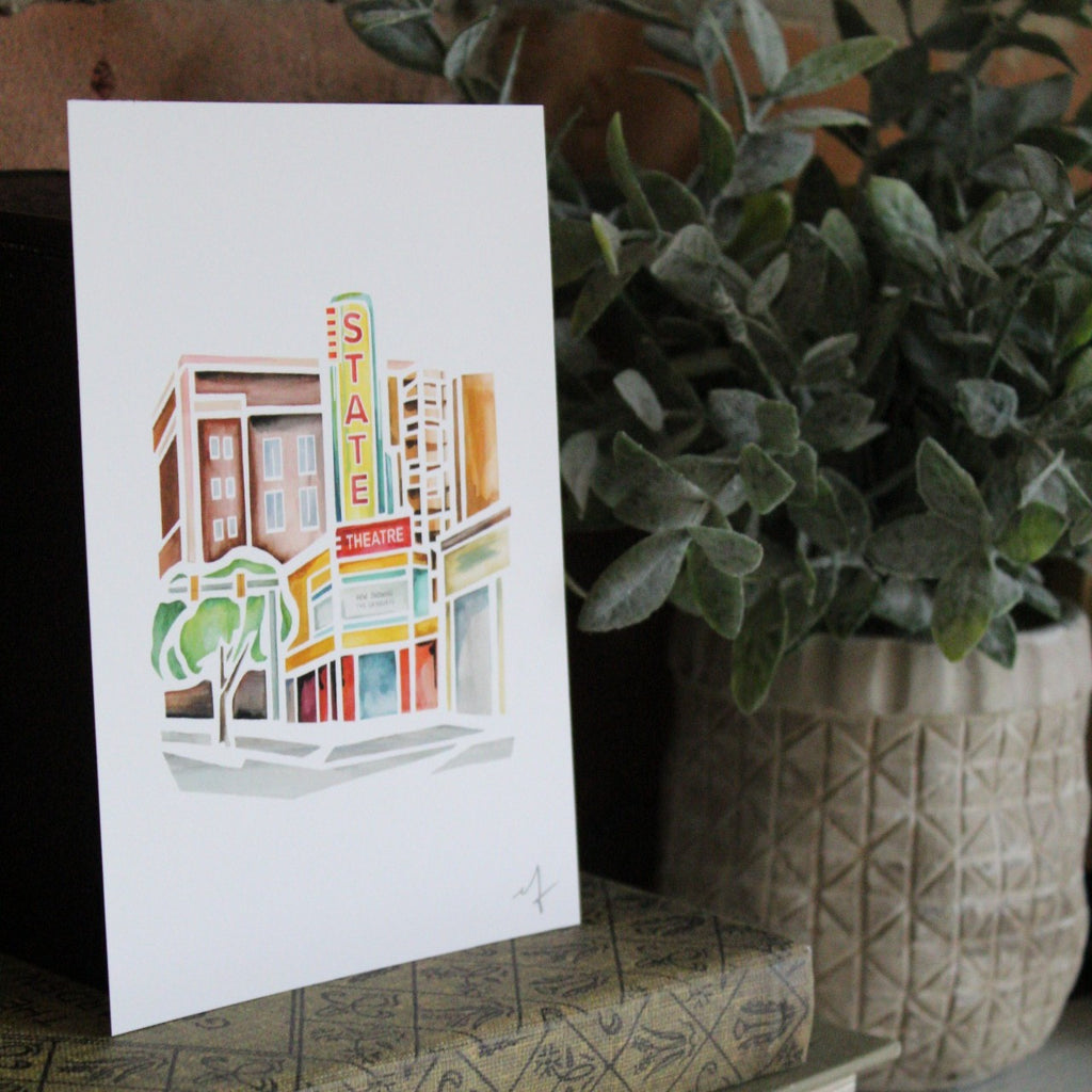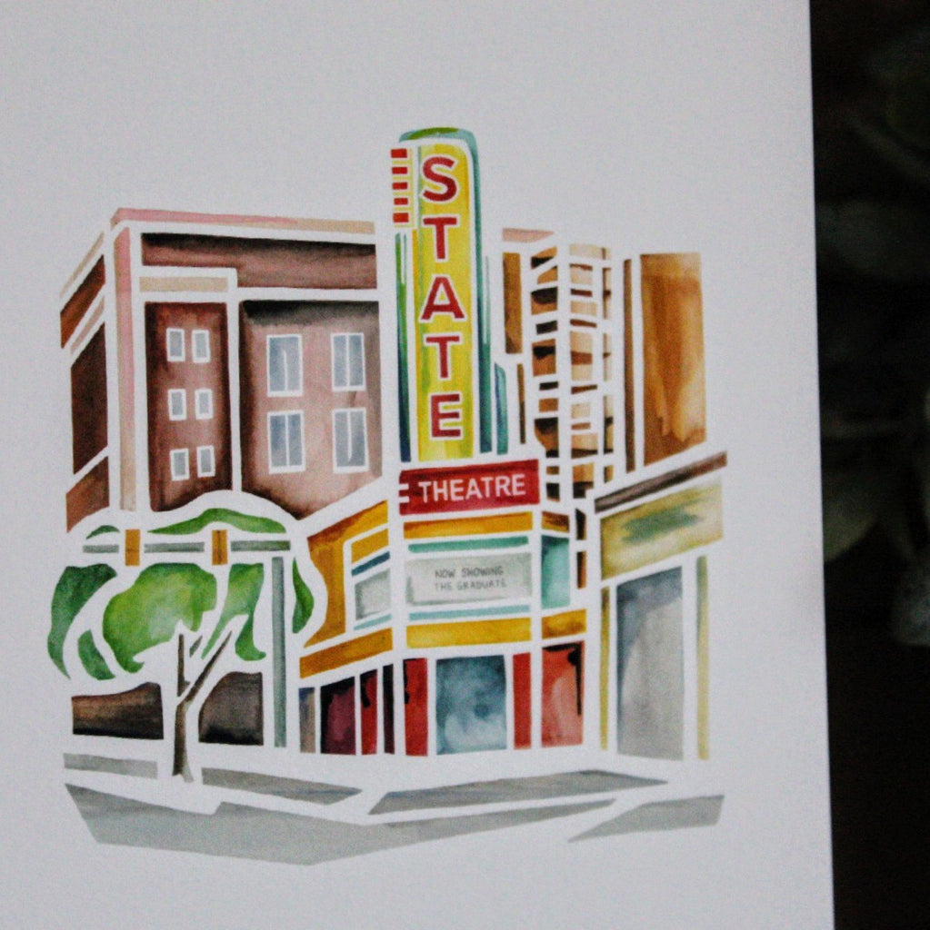 The theater's central location and distinctive green, yellow and red marquee have made it an icon of Ann Arbor's downtown. Done in rich watercolor. Made right here in Michigan!