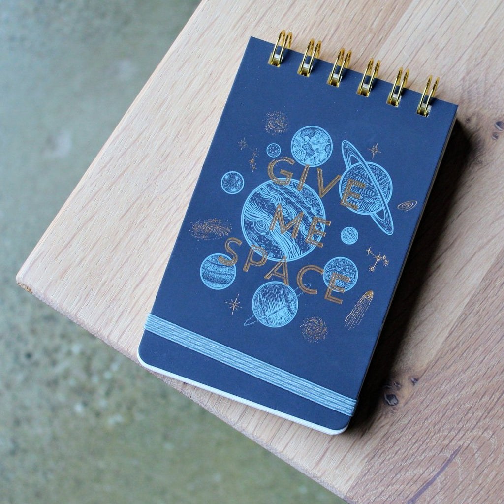 GIVE ME SPACE: Blue note pad with a blue and gold planets in space art-inspired cover with gold foil text and printed with soy based inks, an earth-friendly alternative way of printing that produces deep, rich bright colors and is easier to recycle