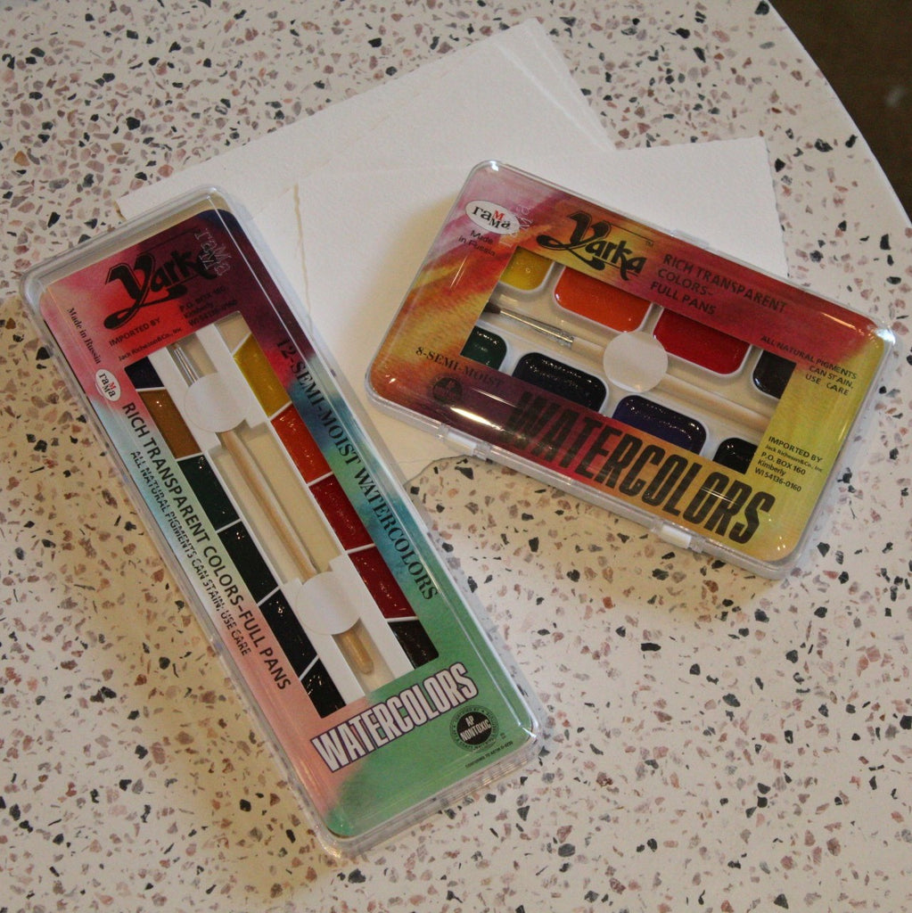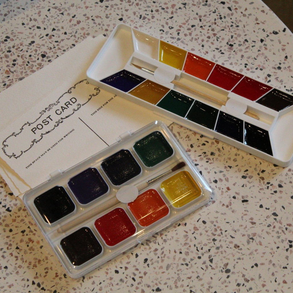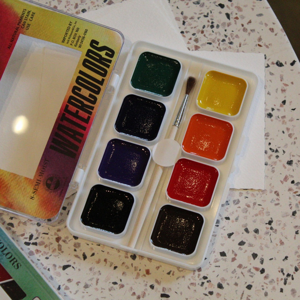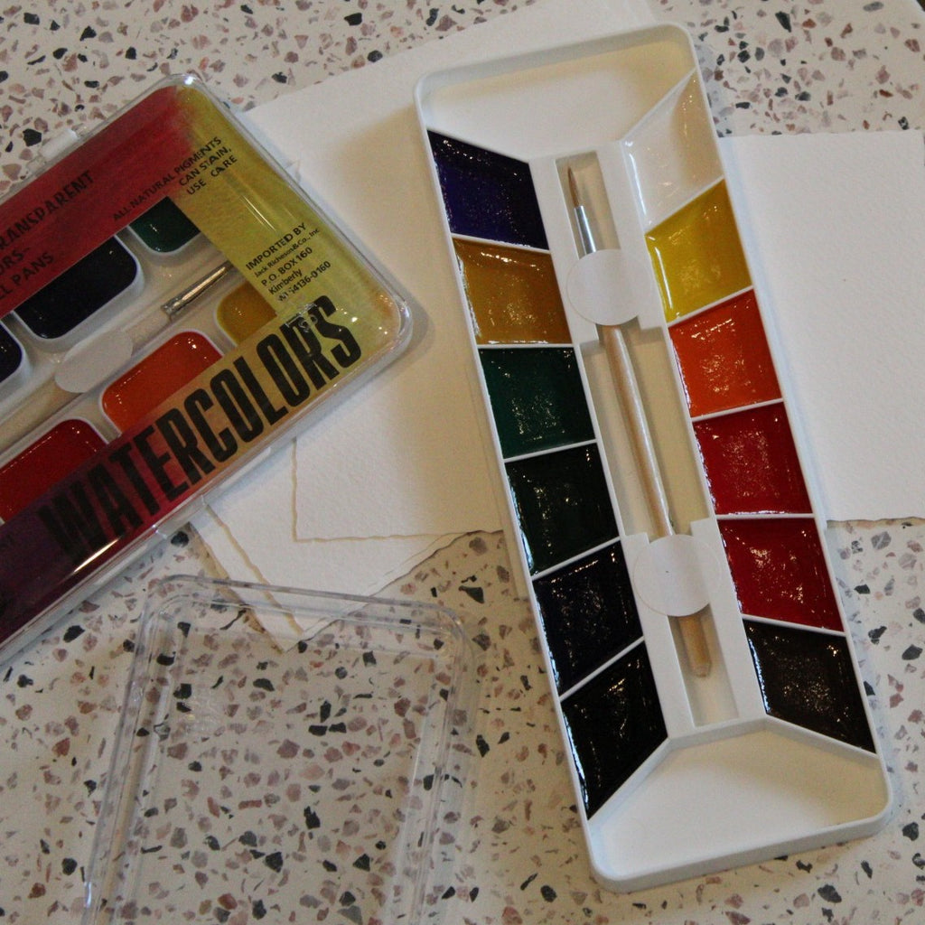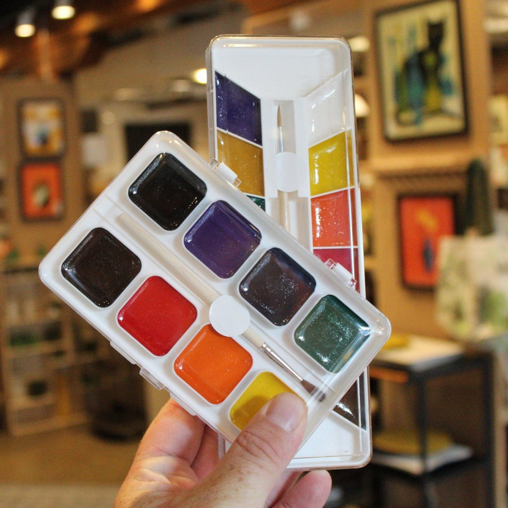 These semi-moist full-pan student grade watercolors are made from all natural pigments and come in rich transparent colors. Sets feature trays with two mixing wells, snap-on lids, and a small brush with each. Non-Toxic, AP certified.