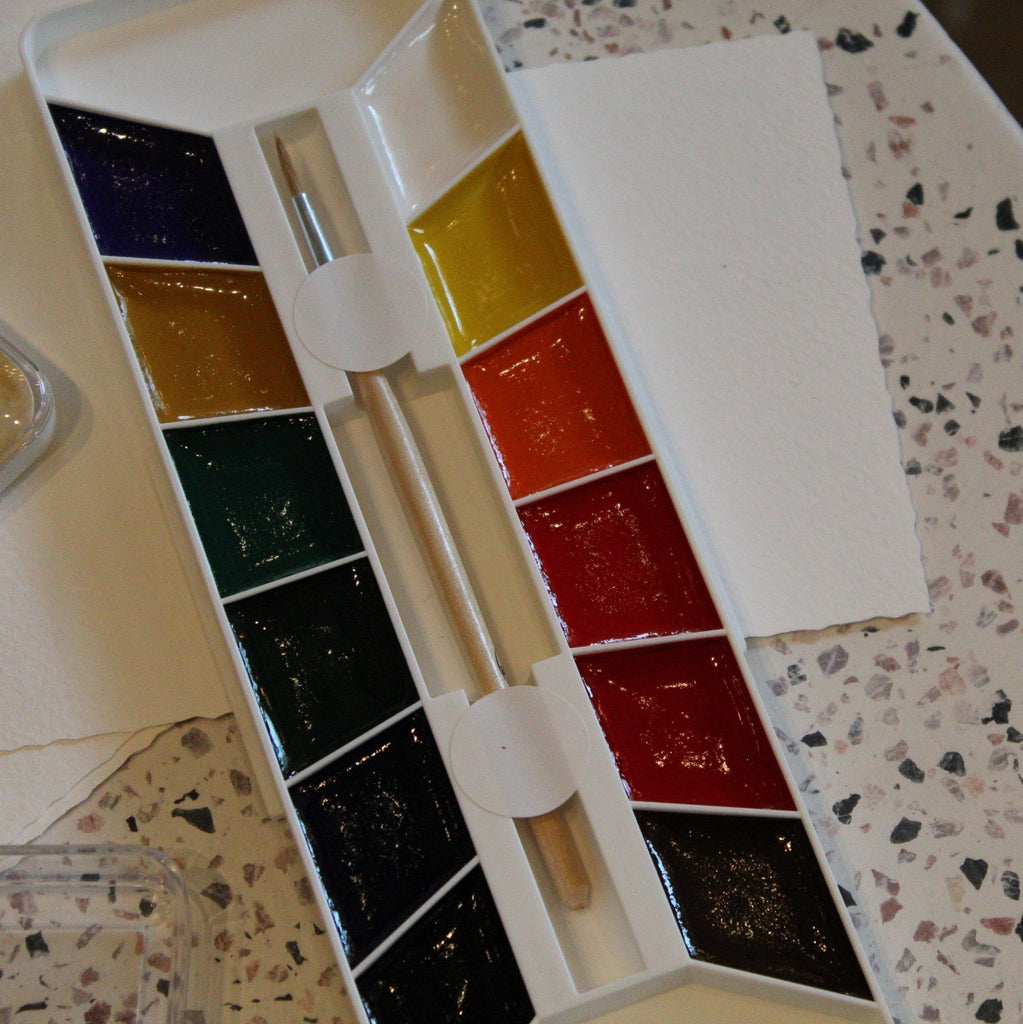 • Set of 12: white, yellow, orange, red, dark red, brown, purple, ochre, green, dark green, blue, and black.