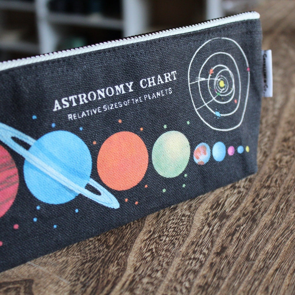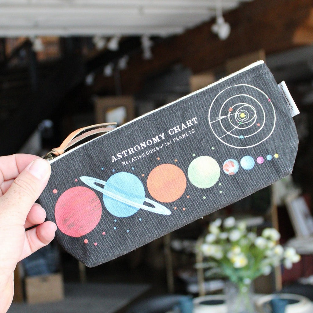 The Astronomy Chart Mini Cotton Pouch makes the perfect coin purse, pencil case, or makeup bag. This chic pouch features vintage illustrations from Cavallini's archives and is made from 100% natural cotton. It also has a dark navy cotton lining, a high-quality YKK zipper, and a leather zipper pull.