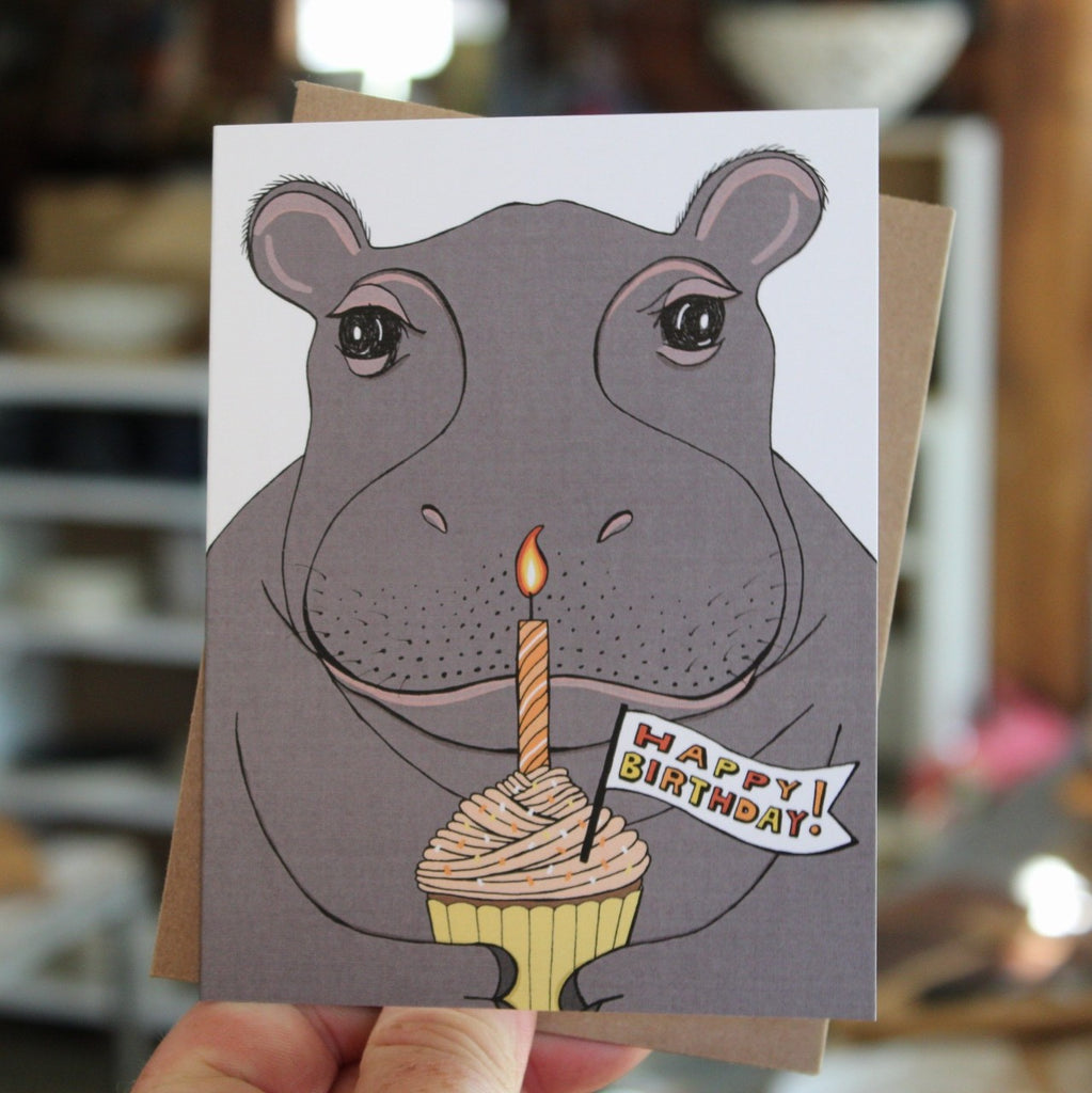 This hand-drawn birthday card featuring a big ol' sweet hippo face delivers a solid happy birthday with cupcakes and candles, too.