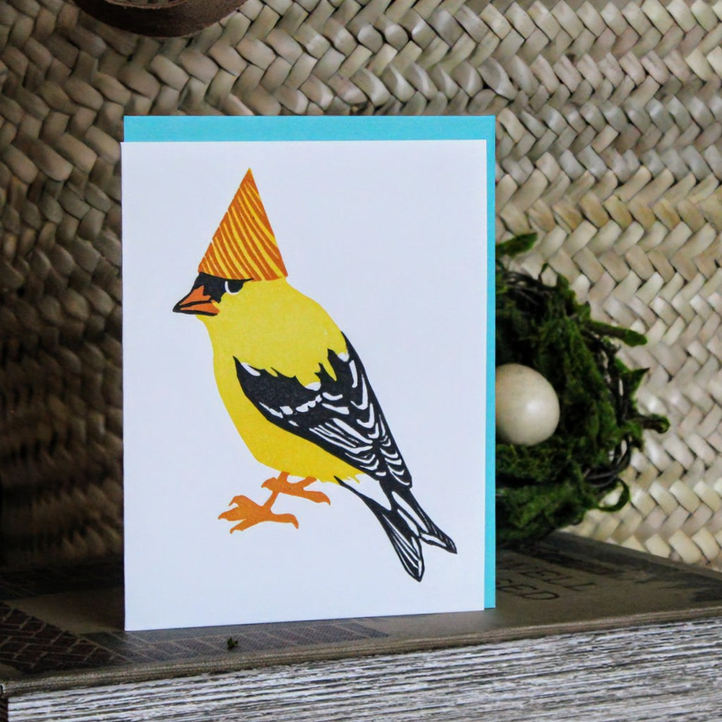 Original block print folded card on 100% cotton paper featuring a hand-carved, letterpress-printed party animal. Each image is carved by hand and letterpress printed in Boiling Springs, Pennsylvania.