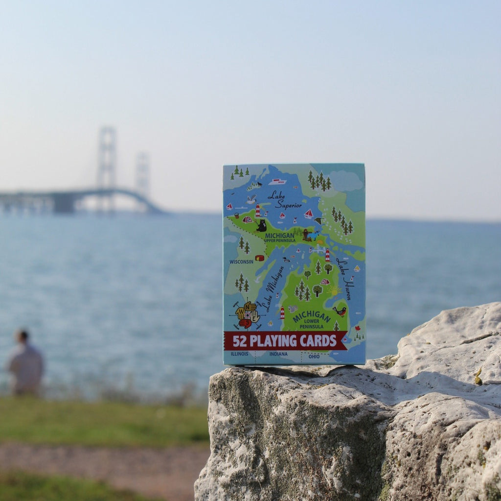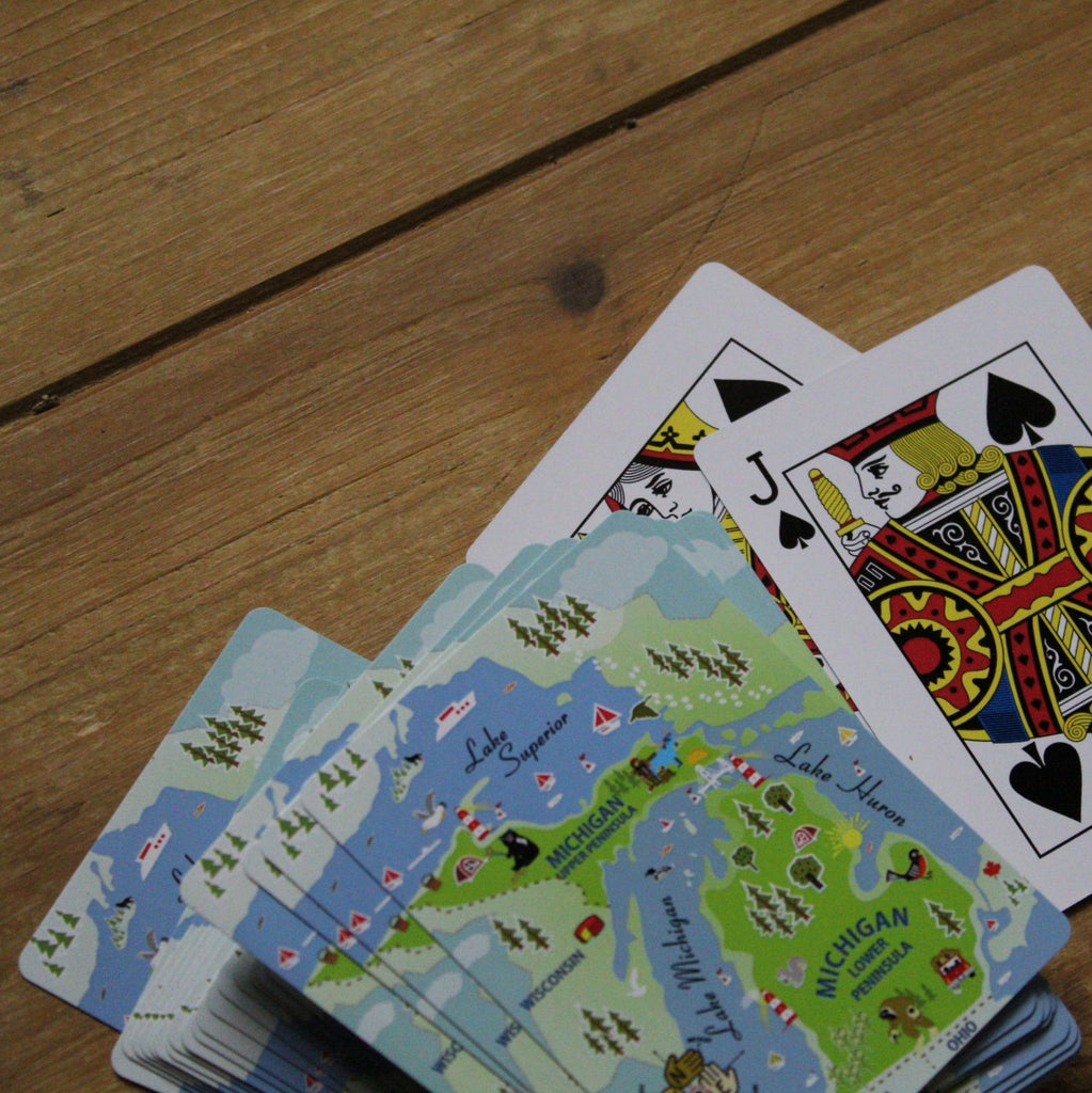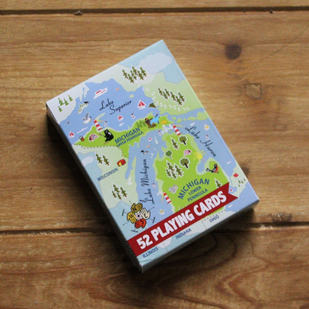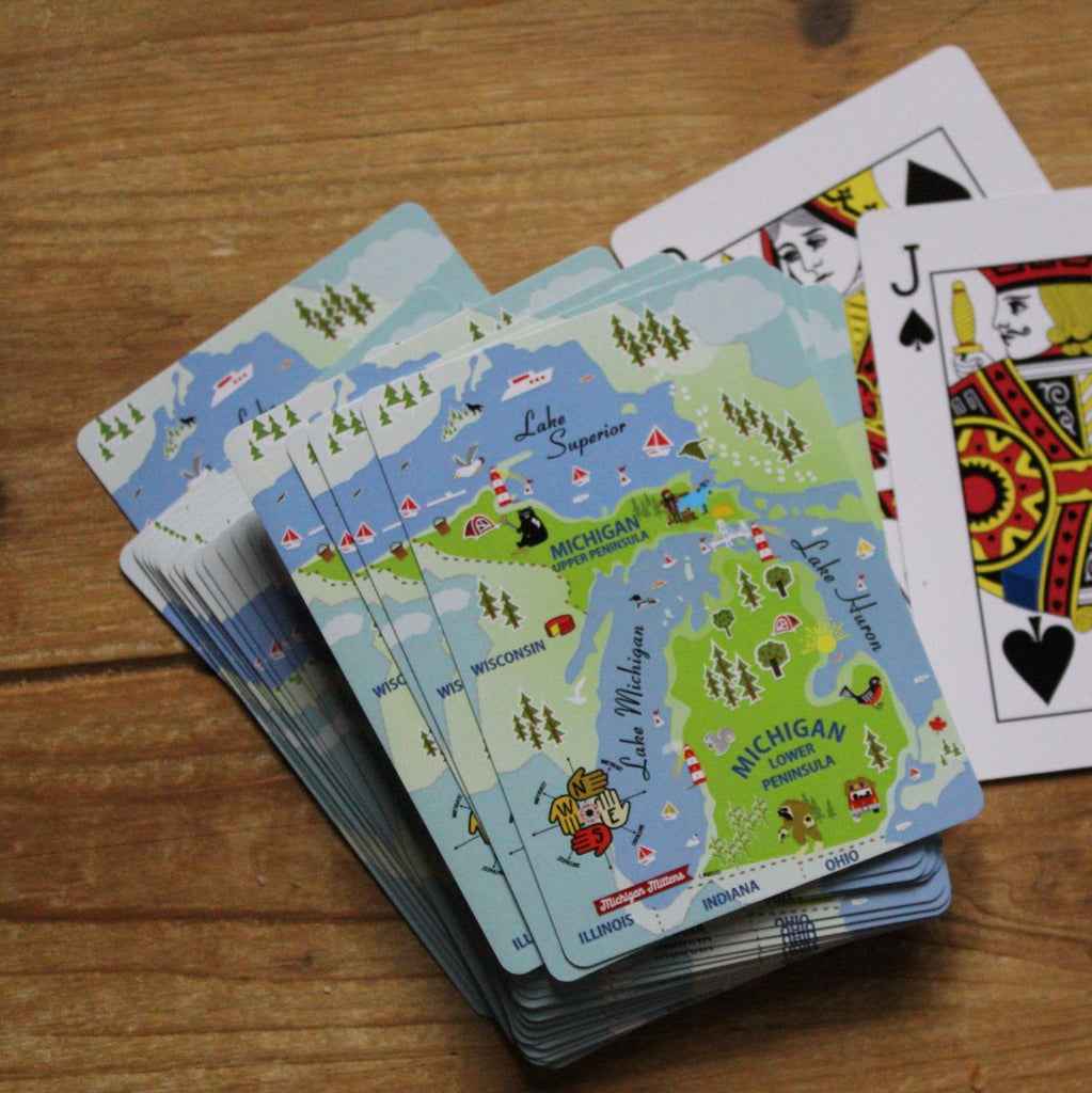 Gather your friends and family around the table for a fun night of poker, euchre, crazy eights or slap jack! Whatever your favorite card game, this Map of Michigan will be a favorite!