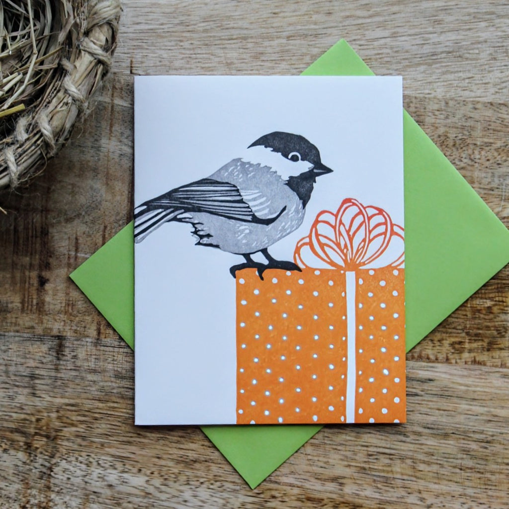 Original block print folded card on 100% cotton paper featuring a hand-carved, letterpress-printed party animal. Each image is carved by hand and letterpress printed in Boiling Springs, Pennsylvania.