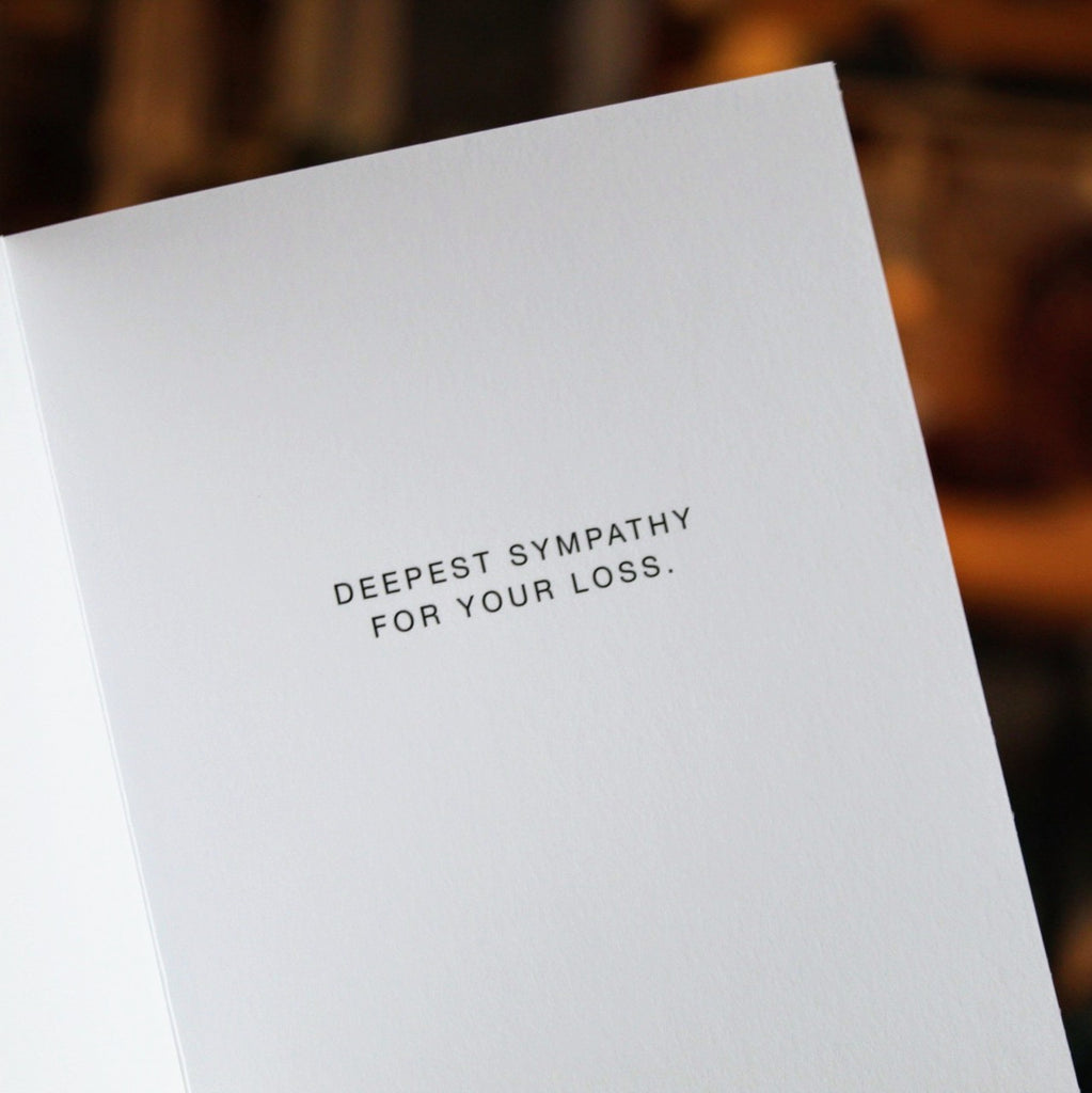 Inside greeting: "DEEPEST SYMPATHY FOR YOUR LOSS"