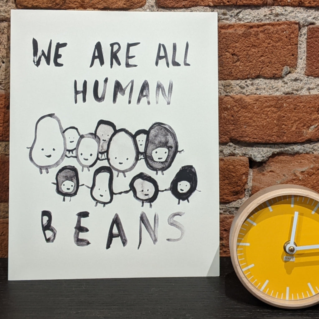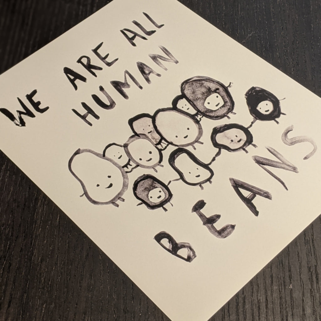We are all Human Beans print, on ivory card stock. Made in Northern California by Desiree B.  Comes in a clear cello sleeve with chipboard.