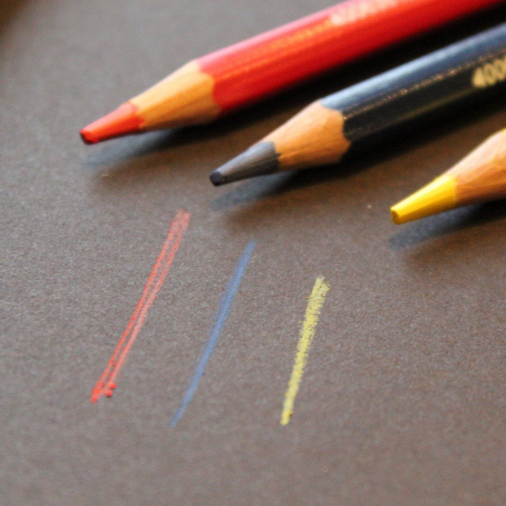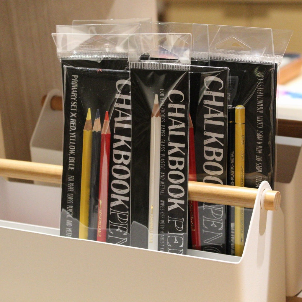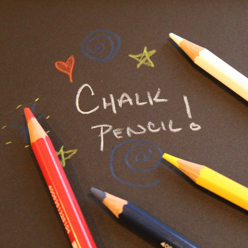Color chalk pencils available in White - a single pencil with the finest white graphite, or in the Primary Set - red, blue, yellow.