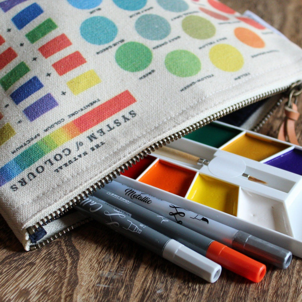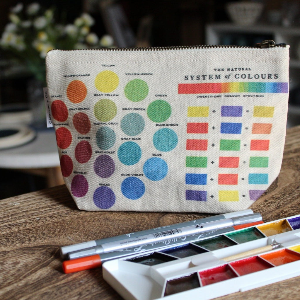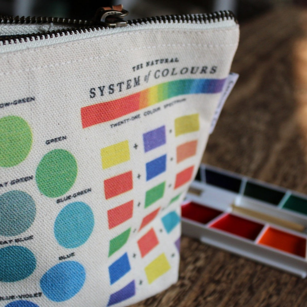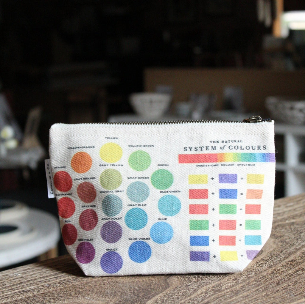 Vintage inspired color wheel chart printed on a zippered pouch made from 100% natural cotton. Featuring a high quality YKK zipper, a leather zipper pull, and dark navy cotton lining. These stylish pouches are perfect for your small art supplies, makeup, and on the go essentials.
