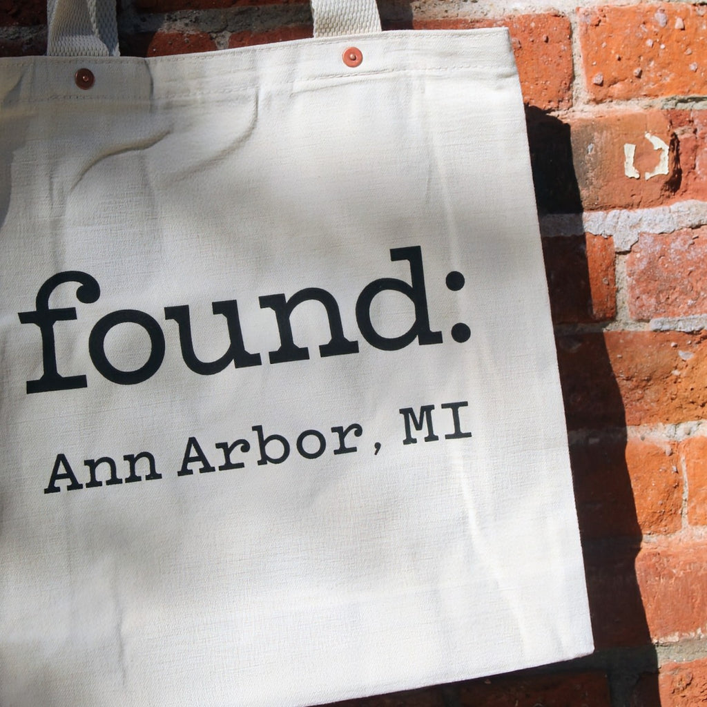 Take a little piece of Ann Arbor everywhere you go with our exclusive FOUND tote bag. Made of 100% brushed cotton canvas featuring our logo printed on one side. Spacious enough for everyday errands, books, groceries, or market finds. A great reusable alternative to show some local love!